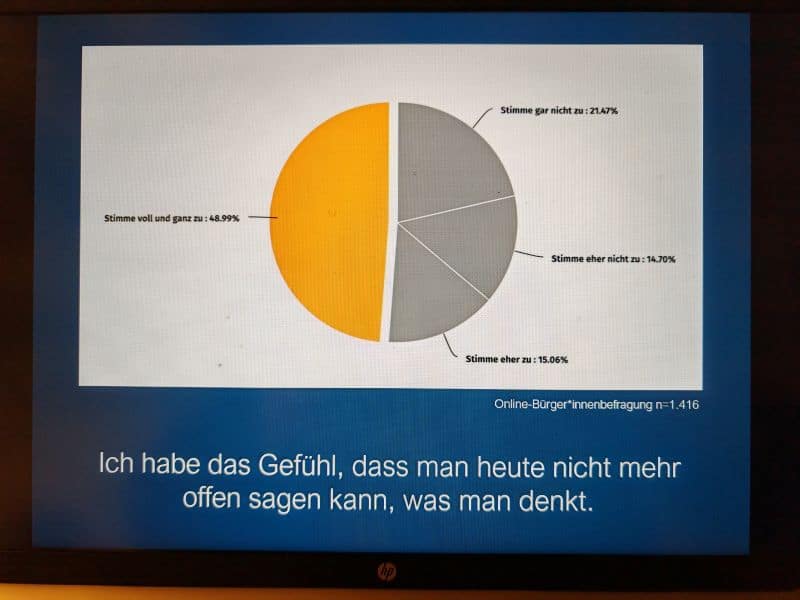 64 Prozent der Teilnehmer haben angegeben, dass sie das Gefühl haben, nicht offen sagen zu dürfen, was man denkt. Auch ein Wert, der aufrütteln muss! Dabei ist eigentlich die Meinungsfreiheit eins der höchsten Güter unserer Demokratie und unseres Grundgesetzes.