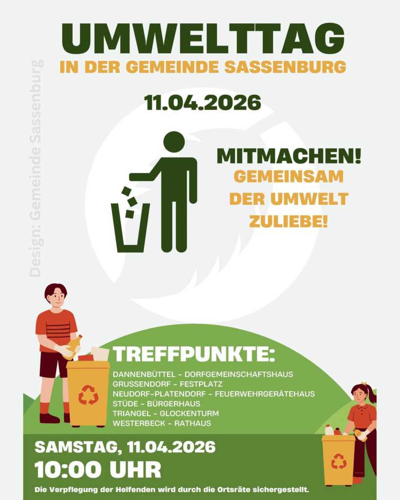 Erinnerung! Am Samstag, den 11. April 2026 findet der diesjährige Umwelttag in der Gemeinde Sassenburg statt. Auch in diesem Jahr treffen sich die fleißigen Müllsammler wieder um 10 Uhr in allen Ortschaften mit den Ortsräten an den bekannten Sammelplätzen, um unsere schöne Landschaft vom Müll zu befreien.
