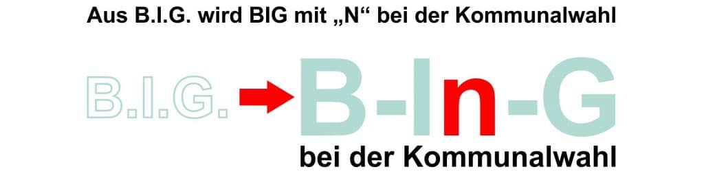 Bereits bei der letz­ten Kom­mu­nal­wahl im Sep­tem­ber 2021 gab es Pro­bleme mit unse­rer Kurz­be­zeich­nung "BIG", da diese auch von der BIG-Par­tei (Bünd­nis Inno­va­tion & Gerech­tig­keit) genutzt wird, von dem wir uns inhalt­lich distan­zie­ren. Nut­zen wir wei­ter die bis­he­rige Kurz­be­zeich­nung, kann die Zulas­sung zur Wahl ver­wei­gert wer­den, da Par­teien einen gesetz­li­chen Vor­zug haben. Daher wird bei der Kom­mu­nal­wahl aus BIG ➡️ BIG mit "N" ➡️B-In-G.