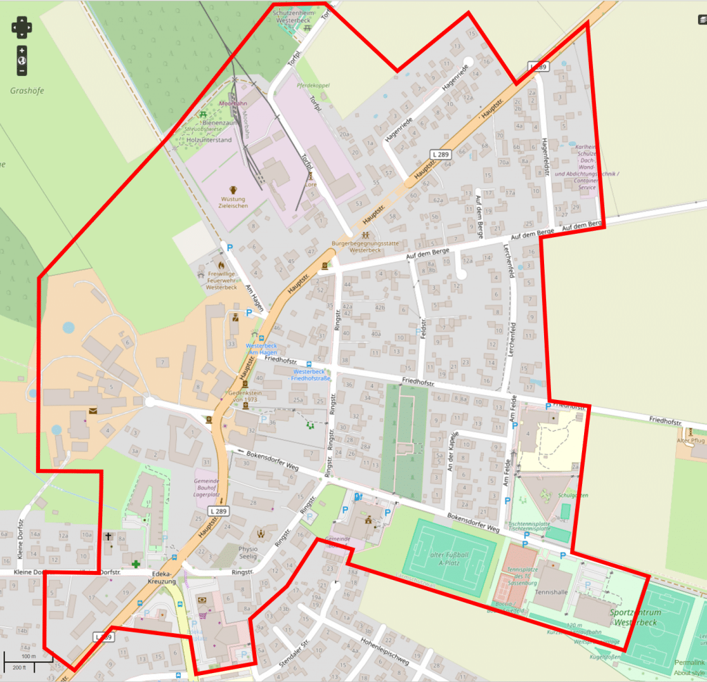Für die erste Info-Veranstaltung wird zunächst nur der nördliche Teil von Westerbeck eingeladen (siehe Kartenausschnitt). Alle erhalten auch noch eine persönliche Einladung in ihren Briefkasten. Für den südlichen Ortsteil erfolgt die Info-Veranstaltung zu einem späteren Zeitpunkt.