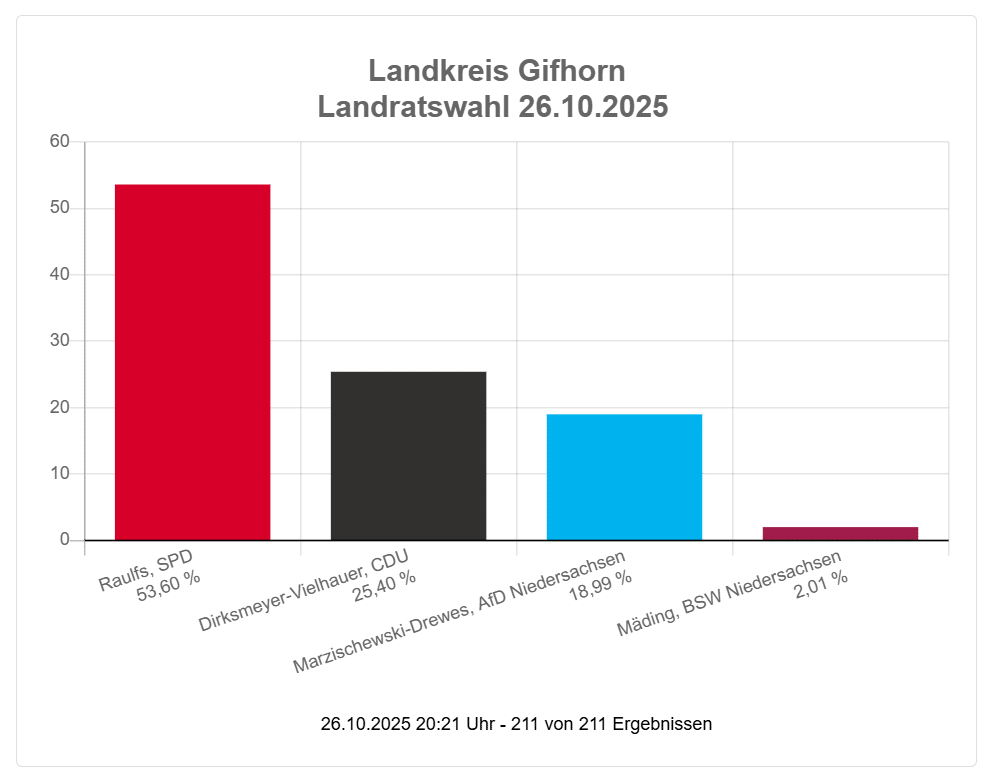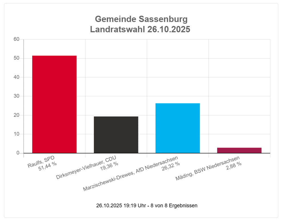 Das Wahlergebnis ist auch eine herbe Niederlage für die Mitbewerber von AfD und CDU. Insbesondere für die Kandidatin der CDU, Telse Dirksmeyer-Vielhauer, die selbst in ihrer Heimatsamtgemeinde Papenteich nicht punkten konnte. Nicht ohne Grund gab es eine Nichtempfehlung von der B.I.G. für eine Philipp Raulfs immer unterlegene Kandidatin. Die Nichtempfehlung hat zumindest in der Gemeinde Sassenburg ihre Wirkung nicht verfehlt. Die CDU hat hier das schlechteste Ergebnis eingefahren.