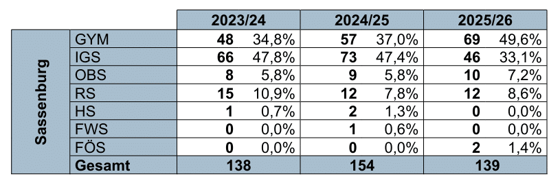 In der Gemeinde Sassenburg ist die Verteilung ähnlich, aber durch das IGS Schulzentrum Sassenburg liegt der Anteil der Schüler, die eine IGS besuchen, deutlich höher bei 33,1 Prozent. Fast 50 Prozent der Schüler wählten als weiterführende Schule das Gymnasium.